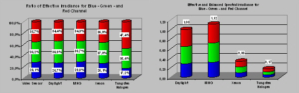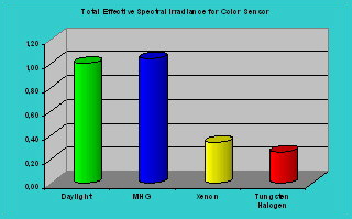 shows that for "Daylight" and the MHG lamps the effective irradiance is about 4 times higher than for Xenon or Tungsten Halogen.