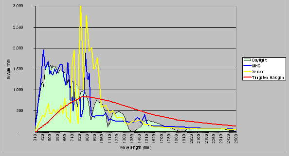 showing the increasing red and decreasing blue ratio for the Xenon and especially for the Tungsten Haloge