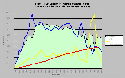 Figure 6 shows the spectral distribution of those sources when standardized to the same irradiance (280–3.000nm).